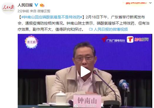 2月18日下午,廣東省舉行新聞發布會,通報疫情防控相關情況。鐘南山院士表示,磷酸氯喹夠不上特效藥,但有治療效果,副作用不大,值得研究和探討。【責任編輯/孟亮】