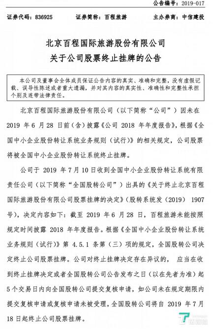 2016年,百城旅行在新三板掛牌公開轉讓。不過,2019年7月,該公司發布公告稱,因未在2019年6月28日前披露2018年年度報告,被中止在新三板掛牌,百程旅行退市。