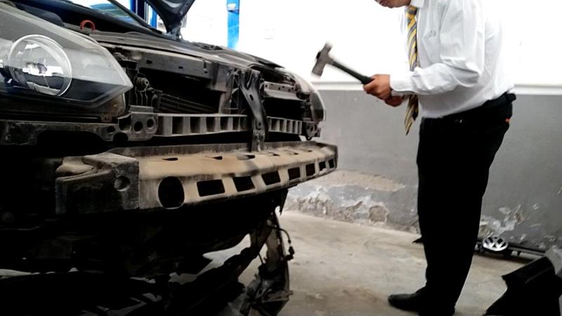 鐺、鐺、鐺……在維修車間,一名4S店員工抄起鐵錘,將一輛送修汽車原本完好的水箱框架砸壞才停下,拍照后才示意維修技師拆解定損。