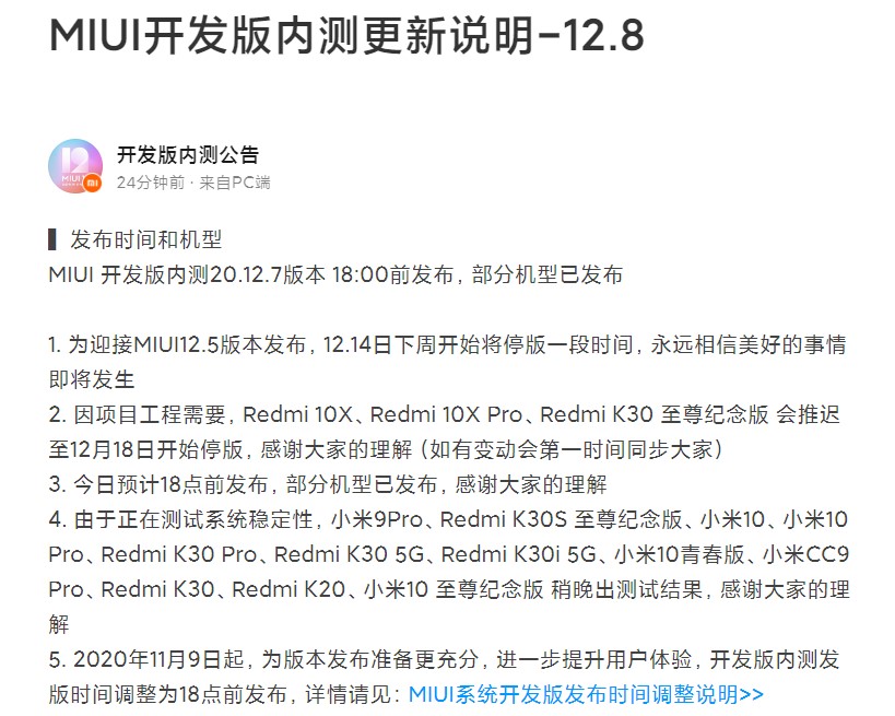 在米粉最關心的發版計劃方面,MIUI12.5當天開啟內測,首批開發版將于1月中旬全量公測。