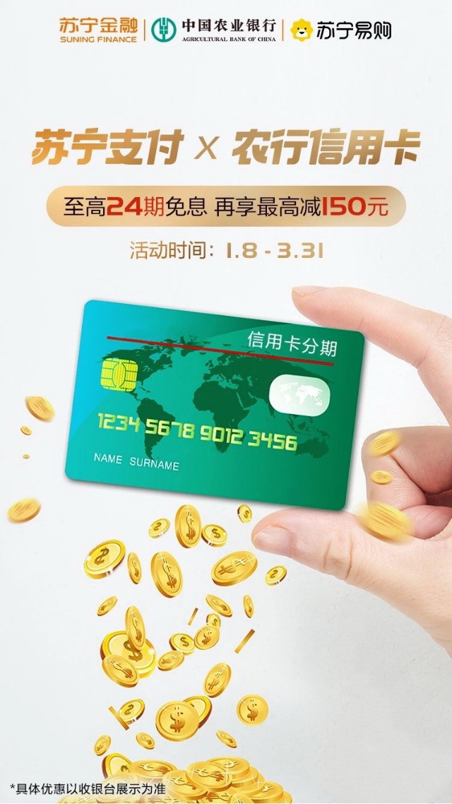 據了解,即日起至2月28日,在蘇寧易購線上商城,購買指定實物類商品,使用蘇寧支付選擇農行信用卡分期支付(商務卡、準貸記卡除外),享受至高24期免息(即0手續費)。