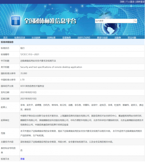 《遠程桌面安全技術要求及檢測方法》團體標準項目,于2020年6月獲得批準立項,歷時一年時間,期間經過征求意見稿、審查稿、報批稿等多項編制和完善工作后終獲正式發布。