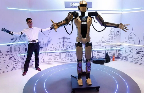 在第十二屆中國-東北亞博覽會上,一名參觀者體驗(yàn)同步操控5G機(jī)器人。(林宏/攝)