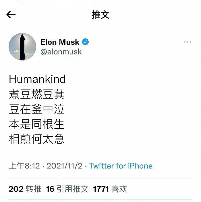 而就在前不久,馬斯克還在推文中發(fā)布了一首《七步詩(shī)》,引發(fā)了不小的熱議: