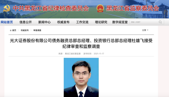 據黑龍江省紀委監委網站11月17日公告,光大證券股份有限公司債務融資總部總經理、投資銀行總部總經理杜雄飛涉嫌嚴重違紀違法,目前正接受中央紀委國家監委駐光大集團紀檢監察組紀律審查和大慶市監察委員會監察調查。
