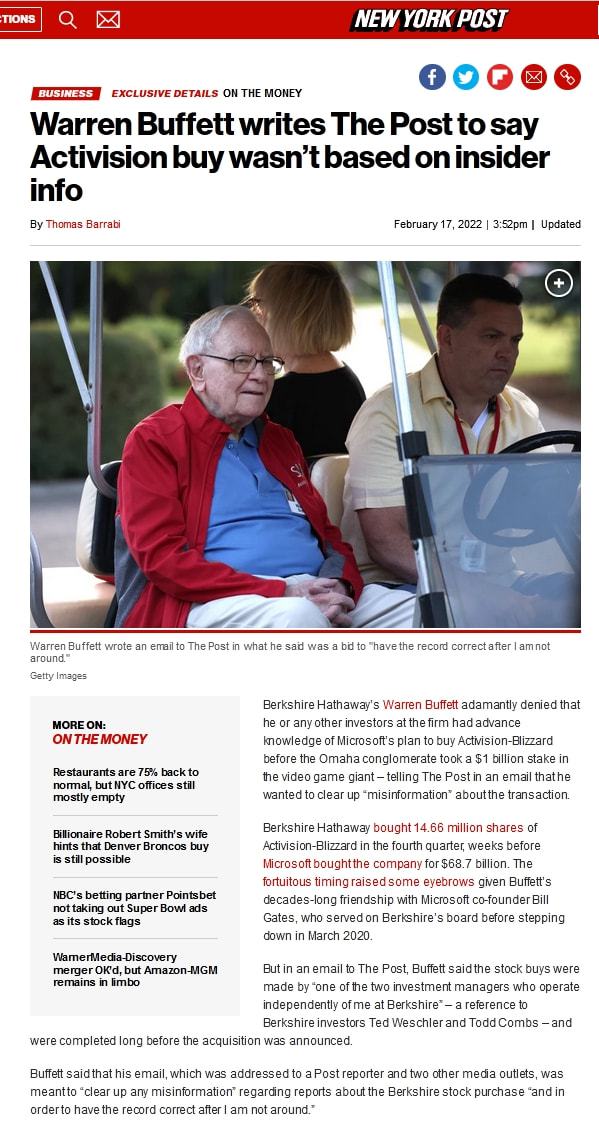 “股神”在信中透露,15大持倉股部分是托德·庫姆斯(Todd Combs)和特德·韋施勒(Ted Weschler)選擇的,兩人對340億美元的投資擁有完全的權力,其中許多投資都沒有達到其在表中使用的門檻值,其中包括此前提及的動視暴雪的買入,目前該股占伯克希爾投資組合的0.3%。此外,托德和特德管理的相當大一部分資金存在伯克希爾旗下企業的各種養老金計劃中,這些計劃的資產未包含在此表中。