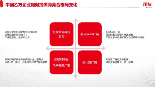這個競合格局圖更鮮明展示了中國乙方企業服務提供商的變化。第一是巨型企業紛紛成立獨立科技公司,助推企業利用新技術:產業數字化、數字產業化。第二是新興的原生創業SaaS公司,借助風險投資快速崛起,快速成長、快速成熟,他們的產品從目前的單點應用擴展為小閉環的解決方案。第三是互聯網廠商、電子商務廠商進入企業服務業,實現業務+IT一體化,為中國企業客戶提供服務。最后一個新的競合格局是云計算廠商,云的時代,中國的云計算巨頭開始作為總的承包商、解決方案商進行多個供應商的整合、集成,統一入口服務。