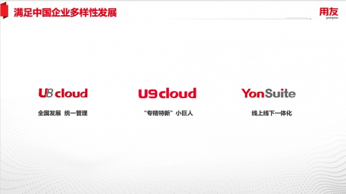中國的企業,中型企業尤其數量龐大,分布在各個產業,呈現著豐富多樣性,一套IT平臺是無法滿足所有的企業訴求。用友提供了多樣性的、針對性的解決方案。如果你是一個全國發展,統一管理的小集團,推薦使用U8 cloud。如果你是一個國家認定的“專精特新”小巨人,建議使用U9 cloud。如果你希望通過線上線下一體化做到高速營收增長,推薦使用云原生的YonSuite。三個套件分別滿足各個特性,不同中型企業的多樣性訴求。