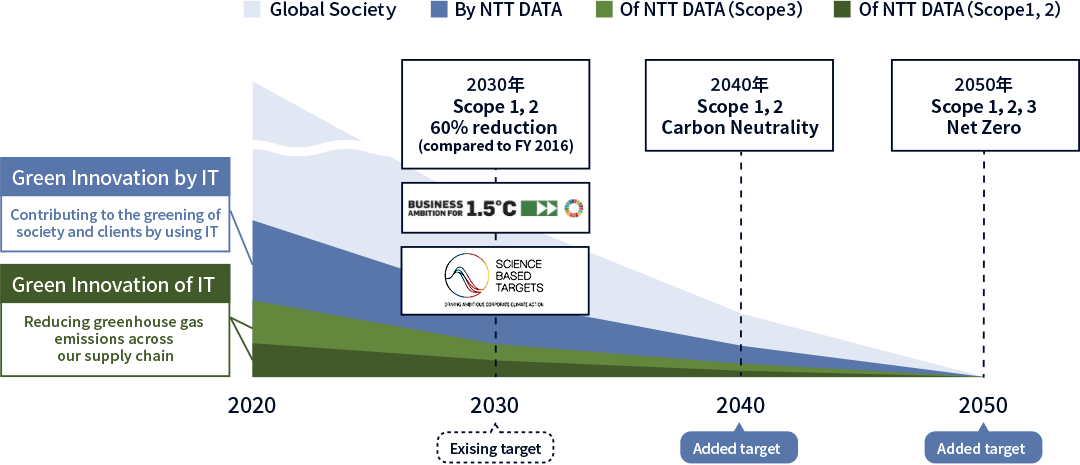 NTT DATA積極設(shè)立各種碳減排目標,采取多項措施以應(yīng)對氣候變化。2020年6月,NTT DATA集團制定了“到2030年,范圍1和范圍2碳排放較2016年減少60%(即全球氣溫上升控制在1.5°C內(nèi)),范圍3碳排放較2016年減少55%,該目標順利通過了SBTi認證。