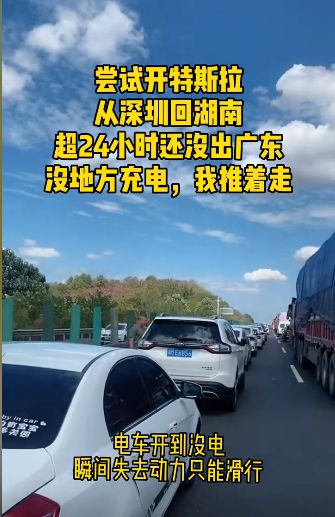10月1日,廣東深圳。一博主發(fā)布視頻稱(chēng),自己開(kāi)特斯拉從深圳回湖南,不料被堵在路上,超24小時(shí)還沒(méi)出廣東,最后車(chē)輛電量耗盡。