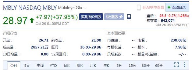10 月 27 日凌晨消息,英特爾旗下自動駕駛子公司 Mobileye 今日正式登陸納斯達克交易所,交易代碼為“MBLY”,開盤價為每股 26.71 美元,較發行價 21 美元大漲 31%。收盤 Mobileye 股價較發行價大漲 37.95%,報 28.97 美元,市值 230 億美元。
