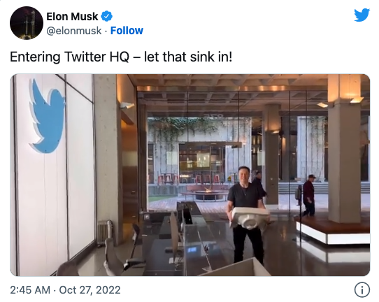 北京時間 10 月 27 日消息,世界首富埃隆?馬斯克 (Elon Musk) 周三現身推特舊金山總部,他發布了一段自己抱著廚房水槽走進辦公室的視頻,并將自己的公開簡介改為“推特領袖”(Chief Twit)。