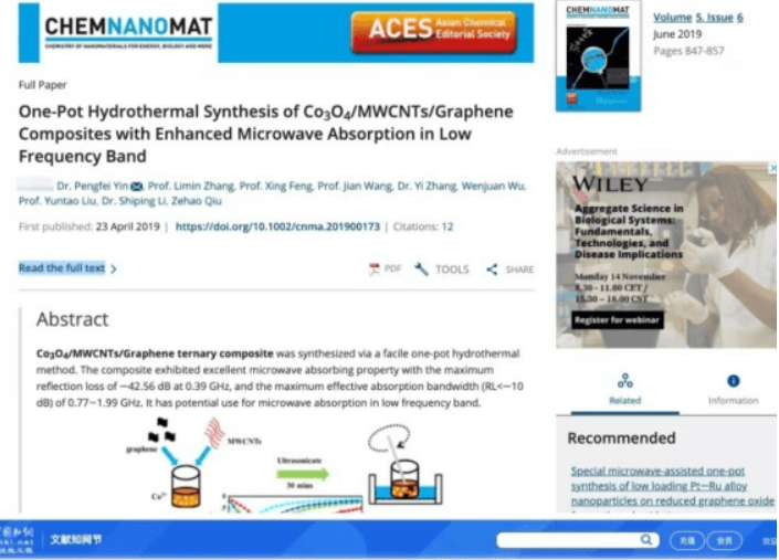 據了解,小李發表的論文為《三元納米復合材料的一步水熱法制備及低頻吸波特性研究)》,該文于2019年4月23日發表在《Chemnanomat(納米材料化學)》期刊上。該期刊是由亞洲化學編輯學會于2014年出版發行,涵蓋納米材料化學領域及其他相關跨學科領域,為SCI期刊。