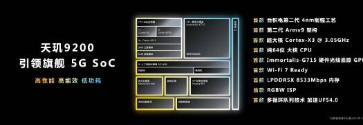 大致看一下官方公布的紙面數(shù)據(jù)和配置,就能感覺到聯(lián)發(fā)科在堆料方面下了很大功夫,天璣9200來勢(shì)洶洶。天璣9200采用了臺(tái)積電第二代4nm工藝和第二代Armv9架構(gòu),搭載八核旗艦CPU,包括1個(gè)主頻高達(dá)3.05GHz的Cortex-X3超大核,3個(gè)2.85GHz主頻的Cortex-A715大核,以及4個(gè)1.8GHz主頻的Cortex-A510小核,并且性能核心全部支持純64位應(yīng)用,要知道64位能帶來更高的能效表現(xiàn),是高端芯片發(fā)展的必然趨勢(shì)。