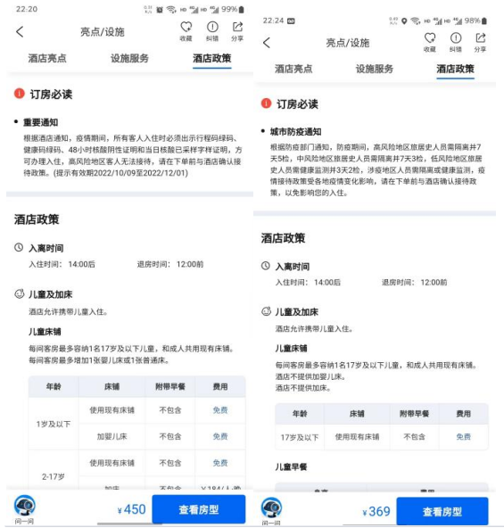 類似的情況還出現在多個酒店。武漢江城明珠豪生大酒店接線人員同日晚間也表示,由于記者提及的朝陽區在區級層面上是“高風險”,還需與當地社區溝通詢問是否可以接待。此外,“中風險地區旅居史人員需隔離并7天3檢”、“低風險地區旅居史人員需健康監測并3天2檢”等要求也明確出現在部分酒店的“酒店政策”一欄中。