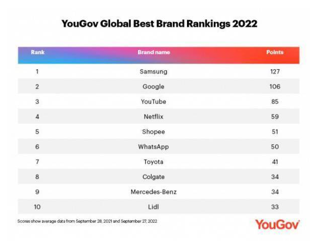 11 月 21 日消息:在全球民意調查公司 YouGov 評選的世界最佳品牌榜中,三星電子首次排名第一,2021 年排名第一的谷歌跌至第二位。
