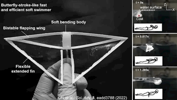 實測中,蝴蝶機器人能夠達(dá)到每秒3.74個體長的速度,比之前的游泳機器人快4倍以上。在此之前,還沒有任何一款游泳機器人能夠在一秒內(nèi)游超過自己體長的距離。
