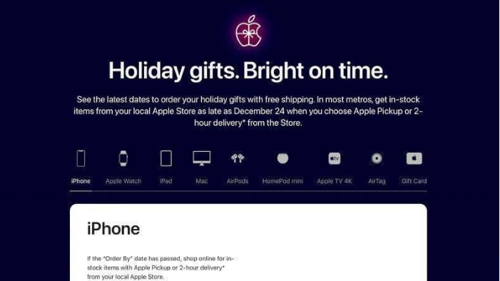 11 月 21 日消息,在宣布黑色星期五促銷活動的同時,蘋果公司近期還發布了其在美國和其他國家 / 地區的假日發貨指南,為希望訂購禮品在 12 月 24 日前到達的客戶列出了最后的期限。