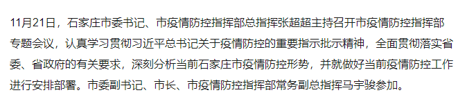 11月22日消息:11月21日,石家莊市委書記、市疫情防控指揮部總指揮張超超主持召開市疫情防控指揮部專題會議,認真學習貫徹習近平總書記關于疫情防控的重要指示批示精神,全面貫徹落實省委、省政府的有關要求,深刻分析當前石家莊市疫情防控形勢,并就做好當前疫情防控工作進行安排部署。市委副書記、市長、市疫情防控指揮部常務副總指揮馬宇駿參加。