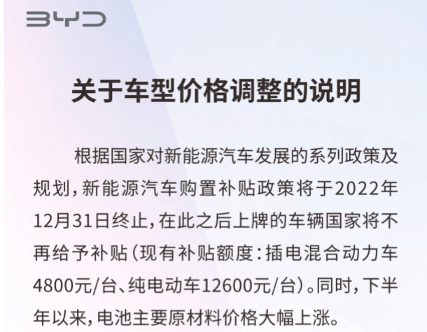 據比亞迪公告,此次對新能源汽車提價原因主要有兩個:一是根據國家對新能源汽車發展的系列政策及規劃,新能源汽車購置補貼政策將于2022年12月31日終止,在此之后上牌的車輛國家將不再給予補貼(現有補貼額度:插電混合動力車4800元/臺、純電動車12600元/臺)。此外,下半年以來,電池主要原材料價格大幅上漲。