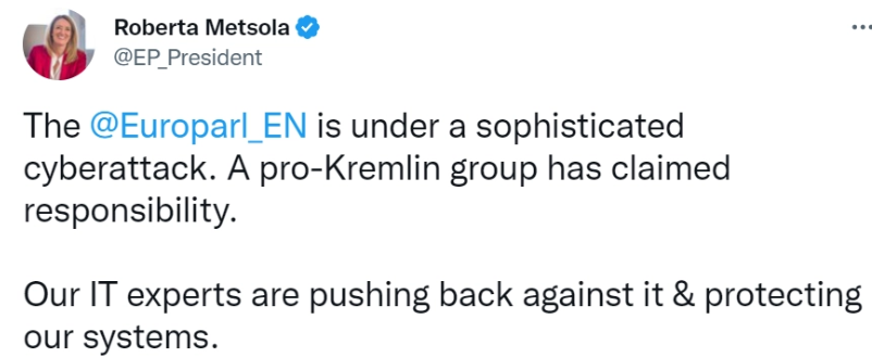 歐洲議會主席梅特索拉(European Parliament President Roberta Metsola)在網站癱瘓后不久發推文稱,“歐洲議會正遭受復雜的網絡攻擊。一個親克里姆林宮的組織(pro-Kremlin group)聲稱對此負責。我們的 IT 專家正在反擊,保護我們的系統。”