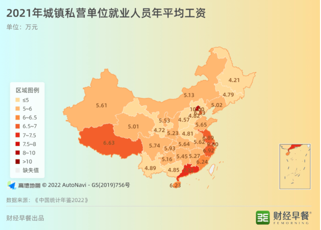 10個省份中,6個來自東部沿海發達地區,即京滬津三大直轄市和粵蘇浙三個東南沿海經濟大省;北京和上海兩地的平均工資均超過19萬元,在各省份中遙遙領先;沿海發達地區外,西部地區的西藏、青海、寧夏、重慶也位居前十。