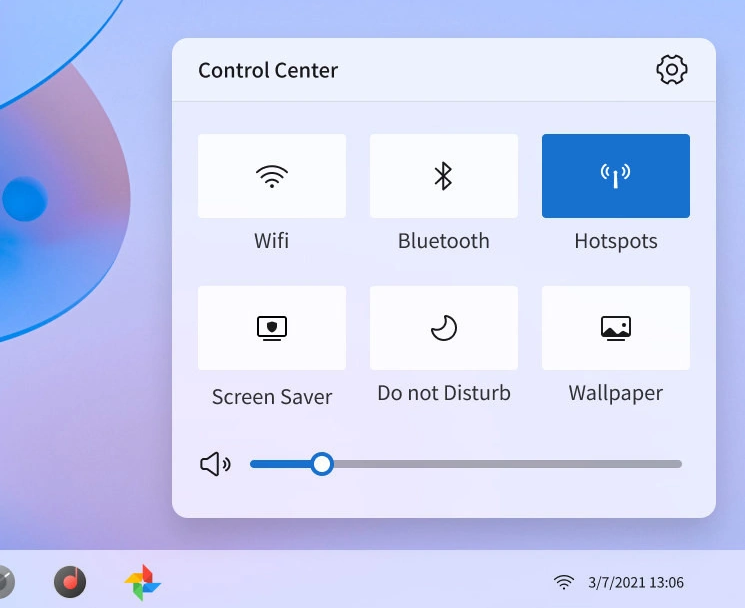 允許快速設置網絡、藍牙、熱點、屏幕保護程序、免打擾模式、墻紙等,方便用戶實時開啟和關閉這些功能;通過右上角的設置圖標快速進入設置頁面。
