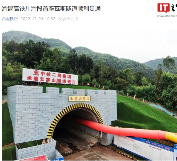 11 月 24 日消息:據(jù)西南鐵路發(fā)布,11 月 23 日 8 點(diǎn) 8 分,隨著最后一次爆破,重慶至昆明高速鐵路川渝段(以下簡(jiǎn)稱渝昆高鐵川渝段)首座瓦斯隧道云霧山隧道順利貫通。