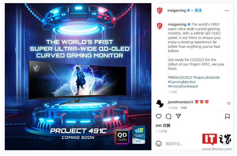 微星稱,Project 491C 是全球首款 240Hz 超寬屏曲面 QD-OLED 游戲顯示器,帶來(lái)無(wú)與倫比的觀看體驗(yàn)。
