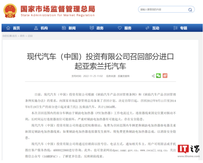 11 月 25 日消息:據國家市場監管總局網站,現代汽車(中國)投資有限公司日前根據《缺陷汽車產品召回管理條例》和《缺陷汽車產品召回管理條例實施辦法》的要求,向國家市場監督管理總局備案了召回計劃。