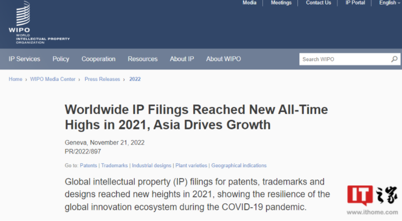 11 月 25 日消息:世界知識產權組織(WIPO)21 日發布的《世界知識產權指標》報告顯示,2021 年全球專利、商標和外觀設計的知識產權申請量均創歷史新高。其中,中國提交的專利申請數量最多,接近全球專利申請量的一半。