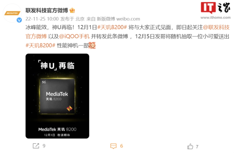 原標(biāo)題:聯(lián)發(fā)科天璣 8200 官宣:12 月 1 日發(fā)布,“冰峰能效、神 U 再臨”