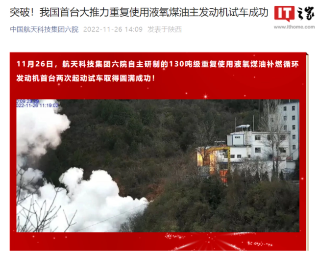 11 月 26 日消息:據中國航天科技集團六院發布,其自主研制的 130 噸級重復使用液氧煤油補燃循環發動機首臺兩次起動試車取得圓滿成功。