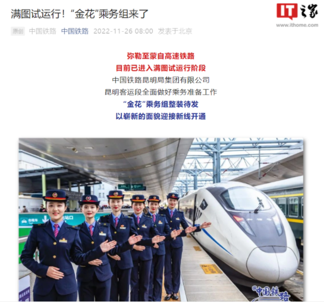 11 月 26 日消息:據(jù)中國鐵路發(fā)布,彌勒至蒙自高速鐵路目前已進(jìn)入滿圖試運(yùn)行階段,中國鐵路昆明局集團(tuán)有限公司昆明客運(yùn)段全面做好乘務(wù)準(zhǔn)備工作,“金花”乘務(wù)組整裝待發(fā),以嶄新的面貌迎接新線開通。