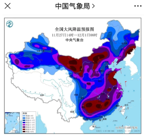 11 月 28 日消息:中國氣象局今日啟動三級應(yīng)急響應(yīng),中央氣象臺繼續(xù)發(fā)布寒潮黃色預(yù)警。