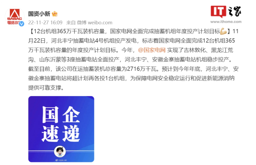 11 月 28 日消息:據(jù)國(guó)資小新官微,11 月 22 日,河北豐寧抽蓄電站 4 號(hào)機(jī)組投產(chǎn)發(fā)電,標(biāo)志著國(guó)家電網(wǎng)全面完成 12 臺(tái)機(jī)組 365 萬(wàn)千瓦裝機(jī)容量的年度投產(chǎn)計(jì)劃目標(biāo)。