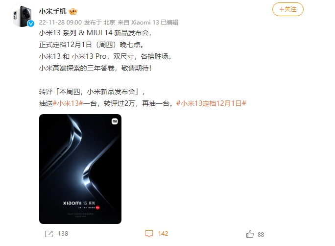 11 月 28 日消息:小米官方今日宣布,小米 13 系列 & MIUI 14 新品發(fā)布會正式定檔 12 月 1 日(周四)晚七點。