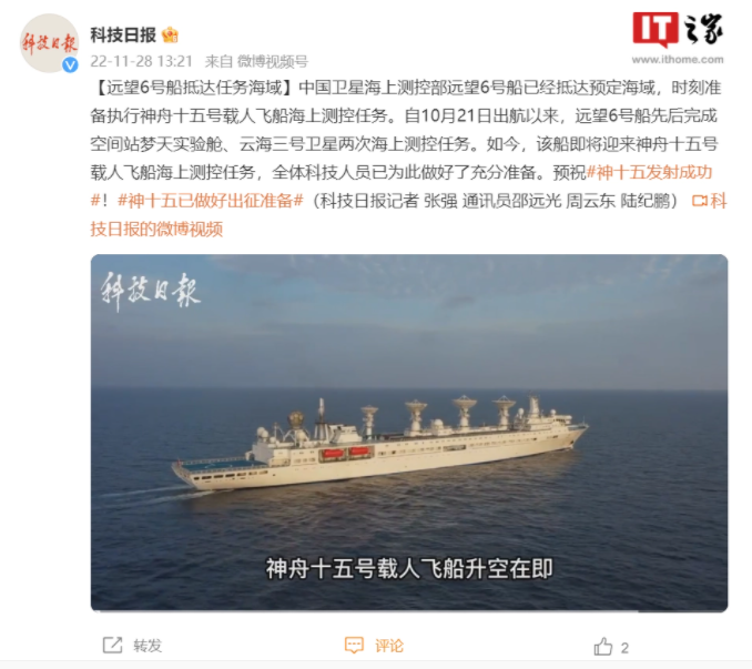11 月 28 日消息:據科技日報報道,中國衛星海上測控部遠望 6 號船已經抵達預定海域,準備執行神舟十五號載人飛船海上測控任務。