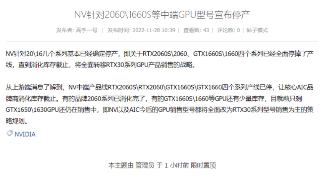 11 月 28 日消息:現有供應鏈人士在博板堂爆料稱,英偉達已決定全面停產 RTX 2060 Super、RTX 2060、GTX 1660 Super、GTX 1660 這四條產品線,目前各廠商庫存消化完即止,目就前只剩 GTX1650 以及 1630 還在銷售中,中端卡型空出來的市場后續將全面轉向 RTX30 系列。