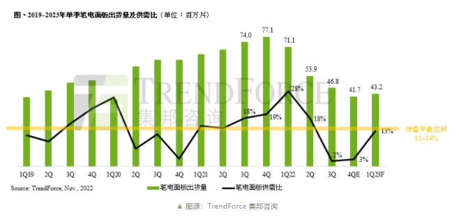 IT之家了解到,展望 2023 年第一季度,盡管為傳統需求淡季,但隨著品牌的面板庫存恢復健康水位,品牌對面板的購買量有望小幅回升。因此,TrendForce 集邦咨詢預估,2023 年第一季筆電面板出貨量將環比增長 3.5%,達 4320 萬片,供需比約 13%。