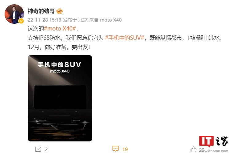 11 月 28 日消息:高通驍龍 8 Gen 2 旗艦手機將于近期扎堆發布,今日上午小米 13 系列高調官宣支持 IP68 防塵防水,今日下午,聯想中國區手機業務部總經理陳勁透露,摩托羅拉 moto X40 也將支持 IP68 防塵防水,將于 12 月發布。