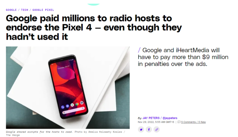 原標題:因讓沒有使用過 Pixel 4 的電臺主持人代言該機,谷歌遭處罰