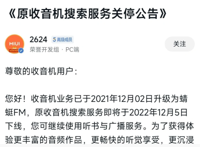 原標題:小米社區發布公告,原收音機搜索服務即將下線