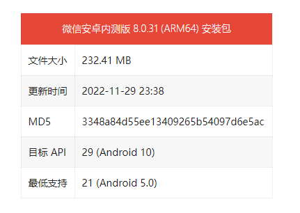 11 月 30 日消息:微信安卓平臺迎來了 8.0.31 測試版更新,本次更新安裝包文件詳細信息如下: