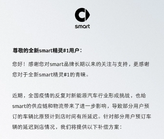 官方表示由于近期全國疫情原因給 smart 供應鏈和物流帶來了進一步影響,導致部分用戶預訂的車輛比原預計到店時間有所延遲。針對部分用戶預訂車輛的延遲到店情況,官方將提供行車記錄儀和積分作為補償。具體如下: