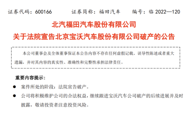 11 月 30 日消息:福田汽車今日發布公告稱,北京寶沃汽車股份有限公司正式宣告破產。