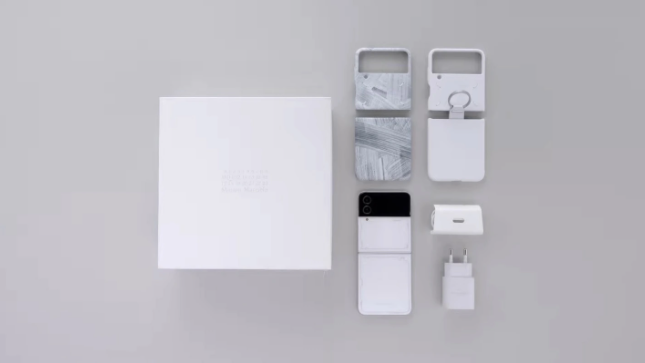 Galaxy Z Flip 4 Maison Margiela 版裝在一個大的白色盒子里,捆綁著兩個 Maison Margiela 皮套(帶有數字編碼環),一根 USB Type-C 電纜和一個 15W 快速充電器。手機采用 Maison Margiela 的標志性白色。兩個皮套都有該品牌標志性的四條縫線徽章。