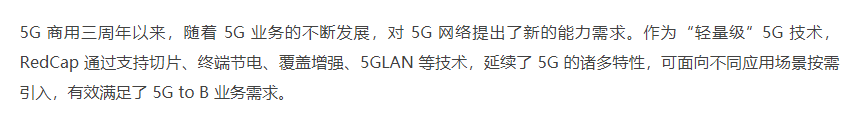 12月1日消息:5G 商用三周年以來,隨著 5G 業務的不斷發展,對 5G 網絡提出了新的能力需求。作為“輕量級”5G 技術,RedCap 通過支持切片、終端節電、覆蓋增強、5GLAN 等技術,延續了 5G 的諸多特性,可面向不同應用場景按需引入,有效滿足了 5G to B 業務需求。