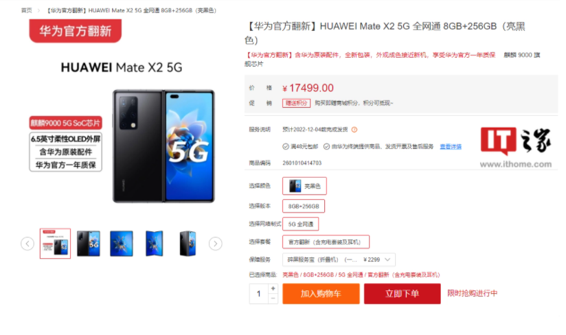 12 月 1 日消息:華為商城昨日上架了 HUAWEI Mate X2 5G 官翻機(jī),目前僅提供亮黑色 8GB+256GB 版本,售價(jià) 17499 元(上市價(jià)為:17999 元)。