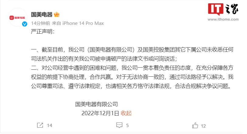 12 月 2 日消息:@國美電器 官方微博今晚發布聲明,稱國美電器及國美控股集團其它下屬公司未收悉任何司法機關作出的有關國美電器被申請破產的法律文書或問詢談話。對公司經營中遇到的困難和問題,公司一貫本著負責任的態度,在充分保障各方權益的前提下協商處理,合作共贏。對于無法協商一致的,通過司法路徑予以解決。本公司尊重司法、遵守法律規定,也請相關各方恪守法律法規,合法合規解決爭議問題